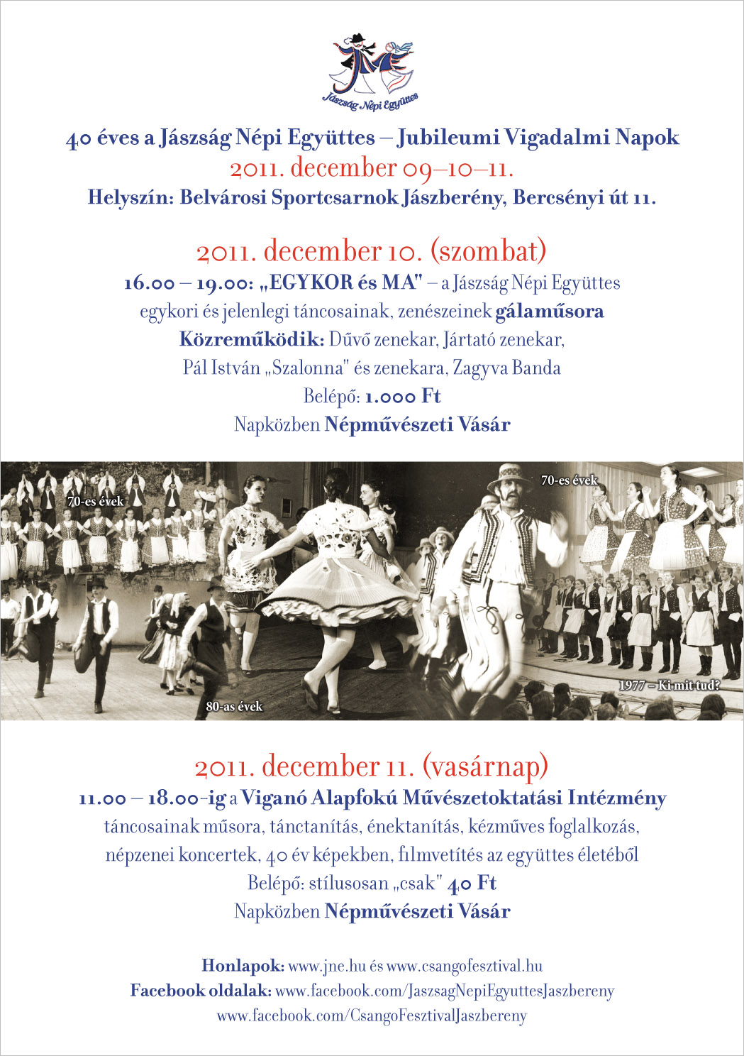 minél nagyobb számban megjelenő közönséget. A rendezvénysorozat idején napközben népművészeti vásár is gondoskodik a kiváló ünnepi hangulatról. A jubileumról részletes tájékoztatást a www.facebook.com/JaszsagNepiEgyuttesJaszbereny oldalán és hamarosan a www.jne.hu honlapon talál! Ünnepeljen együtt decemberben a 40 éves, fesztiváldíjas Jászság Népi Együttesel!